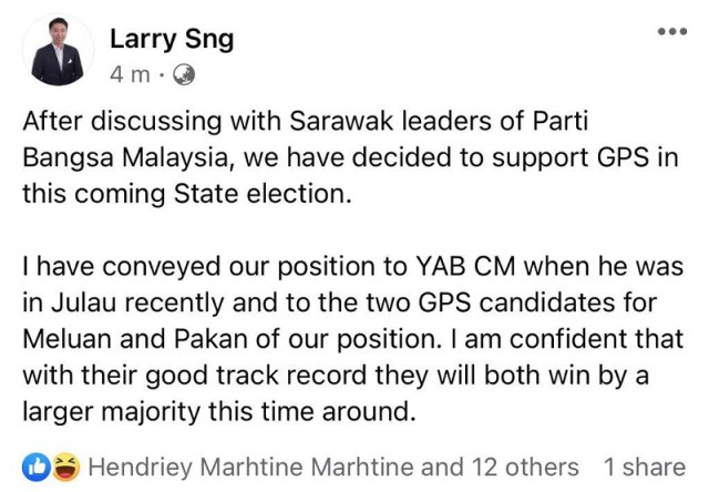 Sng Parti Bangsa Malaysia Will Support Gps In Prn12 Dayakdaily